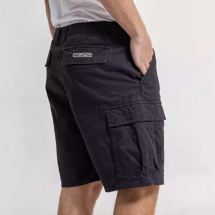 Bermuda cargo Rusty Rippa Charge Ws color negro. Confeccionada en 100% algodón sarga, calce loose fit y múltiples bolsillos funcionales. Ideal para un look urbano y cómodo.